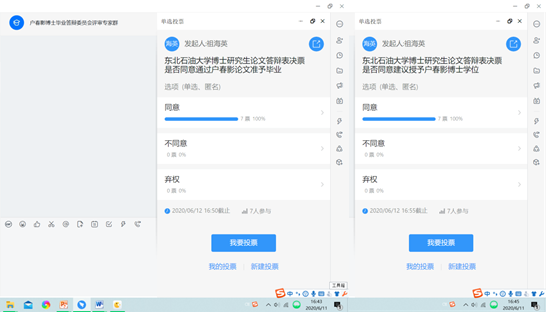 答辩委员会经过评议,并以线上不记名投票方式表决,一致同意通过户春影论文答辩并准予毕业,建议授予户春影工学博士学位,同时,讨论并通过了答辩委员会决议。导师韩国有教授以及相关师生全程参加了视频答辩。