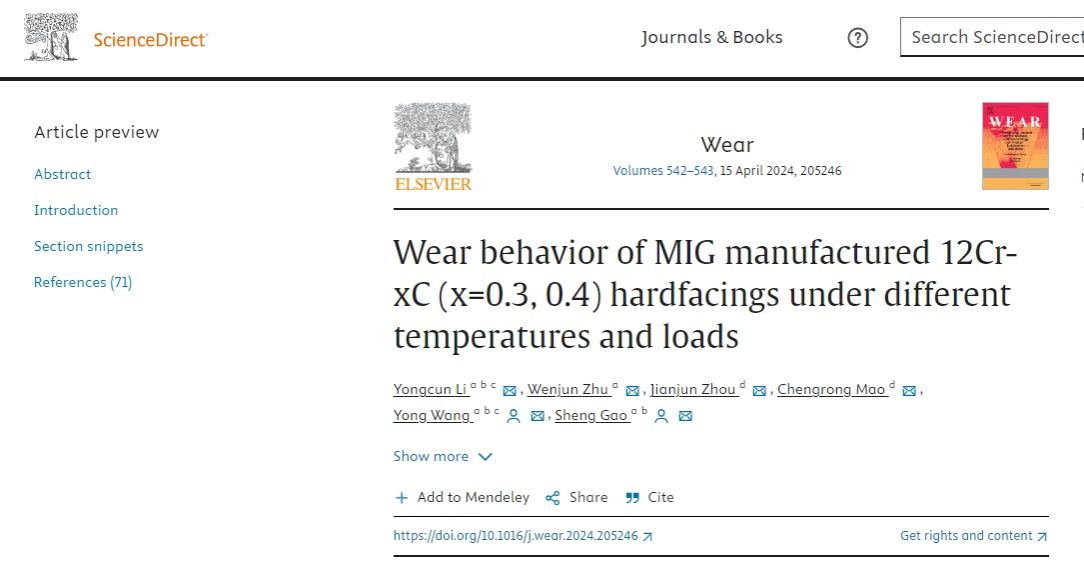 best3652021级硕士研究生朱文俊在《Wear》(IF=5.0,中科院一区top期刊)上发表题为“Wear behavior of MIG manufactured 12Cr-xC (x=0.3, 0.4) hardfacings under different temperatures and loads ”的研究论文。(DOI:https://doi.org/10.1016/j.wear.2024.205246)。