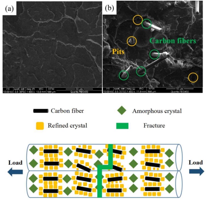该论文属于增材制造领域。熔融沉积是制备复杂形状热塑性部件的常用方法,现已被广泛运用于航空航天、医疗等多个领域。PLA(聚乳酸)具备环保、廉价、无毒等优点,是制造熔融沉积产品的理想材料,但纯PLA产品的韧性及强度较差。因此,学者们采用多种方法探究了影响PLA零件力学性能的因素,但当前多数研究的关注点为加工工艺与PLA零件力学性能的交互影响规律,关于CF(碳纤维)等增强相对熔融沉积PLA复合材料力学性能影响的研究成果则较少。因此,该研究通过熔融沉积方法同时制备了PLA和PLA/CF试样,并结合X射线衍射、扫描电镜、热重分析仪、差示扫描量热计以及电子万能试验机等设备分别表征了PLA和PLA/CF试样的微观结构、断口形貌、热稳定性及抗拉强度等参数及指标,分析了CF增强相对PLA试件力学性能的增强机理,为拓宽PLA等材料在增材制造领域的应用范围提供了理论依据。