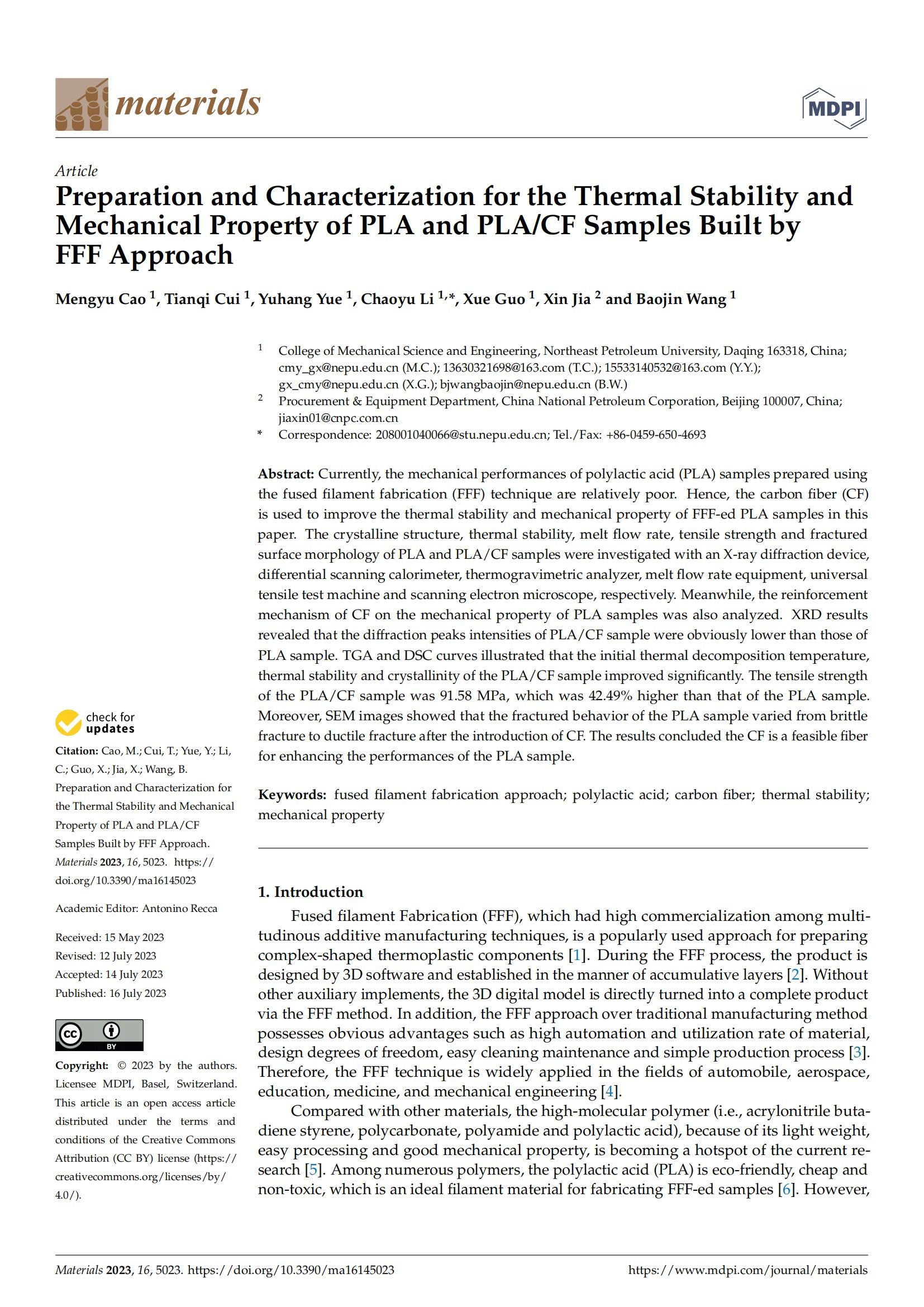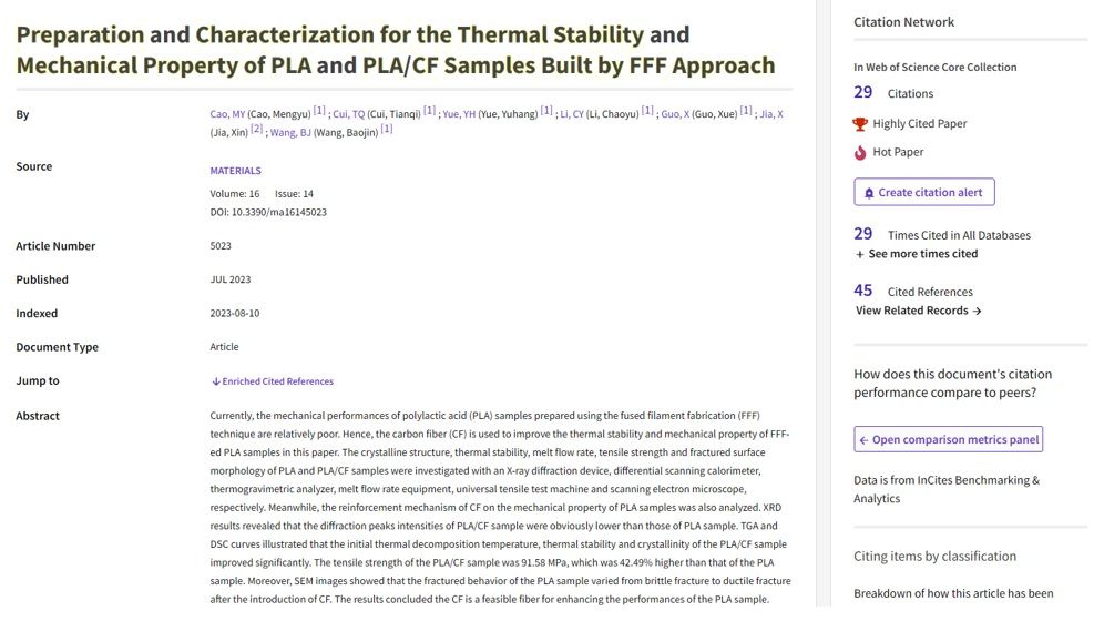 据ESI(Essential Science Indicators, 基本科学指标)数据库2024年3月的数据显示,best365机电工程系青年教师曹梦雨为第一作者发表的学术论文“Preparation and Characterization for the Thermal Stability and Mechanical Property of PLA and PLA/CF Samples Built by FFF Approach”(DOI:doi.org/10.3390/ma16145023)同时新增入选为ESI高被引论文(ESI-Highly Cited Papers)与ESI高热点论文(ESI-Hot Papers)。该论文由best365青年教师国雪、王宝金及研究生崔天奇、岳宇航、李超宇及中国石油天然气集团有限公司工程师贾鑫共同完成。