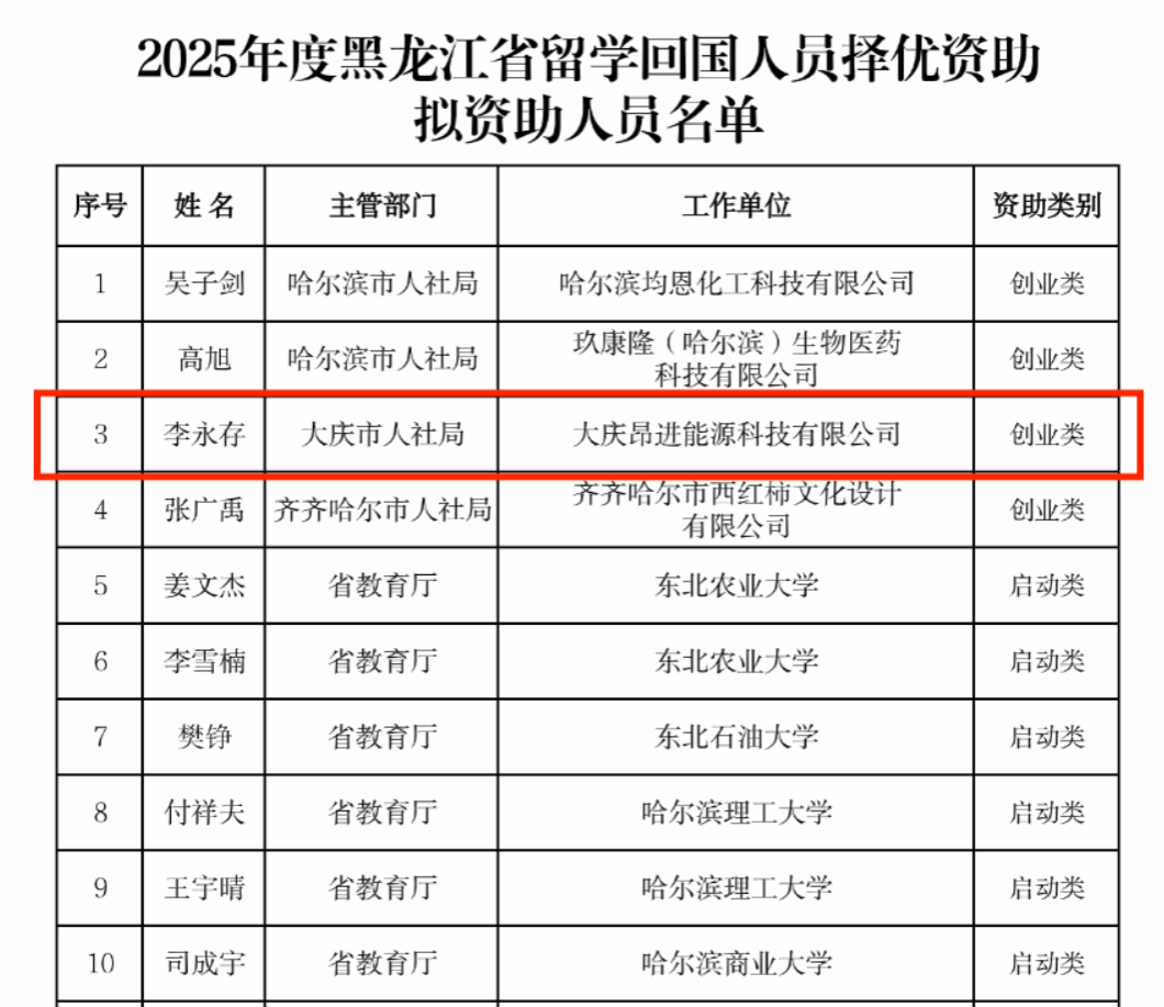 近日,黑龙江省人力资源和社会保障厅按照《关于开展2025年度黑龙江省留学回国人员择优资助工作的通知》(黑人社函〔2025〕450号)有关安排,对2025年度黑龙江省留学回国人员择优资助人员进行公示。best365教师李永存入选本年度拟资助人员名单,本年度创业类全校仅有1人入选。