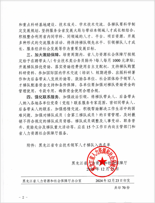 据悉,黑龙江省专业技术领军人才梯队是培养、吸引、使用、储备高层次专业技术人才的专项工程,聚焦基础应用研究、重点产业领域、特色专业学科和关键核心技术,通过年度新建、梯次培育、动态调整、持续培养等方式,培养一批自主创新能力强、发展潜力大、专业贡献突出、引领作用显著、集聚效应明显的高层次人才和梯队,为新时代龙江全面振兴全方位振兴提供人才支撑。